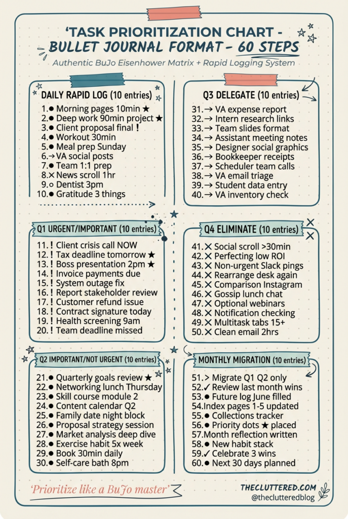Lost in endless to-do lists? Our Task Prioritization Chart in Bullet Journal Format delivers 60 authentic BuJo entries combining Eisenhower Matrix urgency/importance with Ryder Carroll’s rapid logging system. Perfect for bullet journal task prioritization, BuJo productivity layouts, daily priority charts.