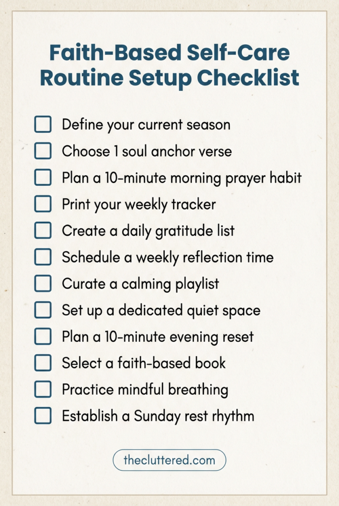 You do not have to fix everything this week, friend. Tiny, gentle, faith-filled steps count just as much as big ones. Start with one part of this faith-based self-care routine, let God meet you there, and let the rest grow slowly. Save this post so it’s easy to find on the hard days, and follow @theclutteredblog on Pinterest for more cozy, biblical, and practical ideas to help your soul breathe again.
