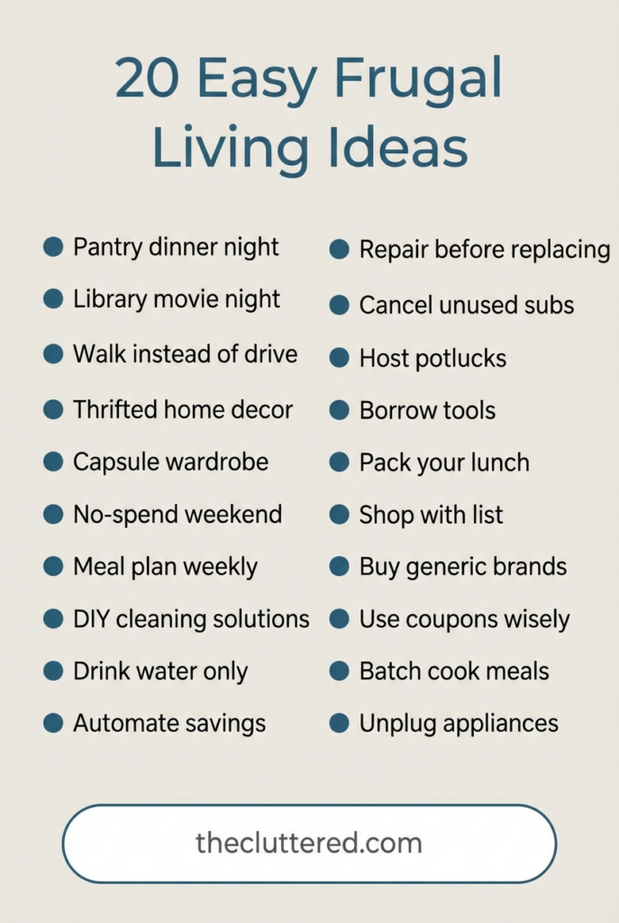 You don’t need to become a frugal living expert overnight. Pick one or two simple actions from this guide—maybe a weekly frugal meal planning session and a small frugal money challenge—and try them for the next 7 days. If you mess up, just reset and keep going; this is a lifestyle shift, not an all-or-nothing test. Save this post so you can revisit the ideas later, and follow @theclutteredblog on Pinterest for more calm, cozy, realistic money and home tips.