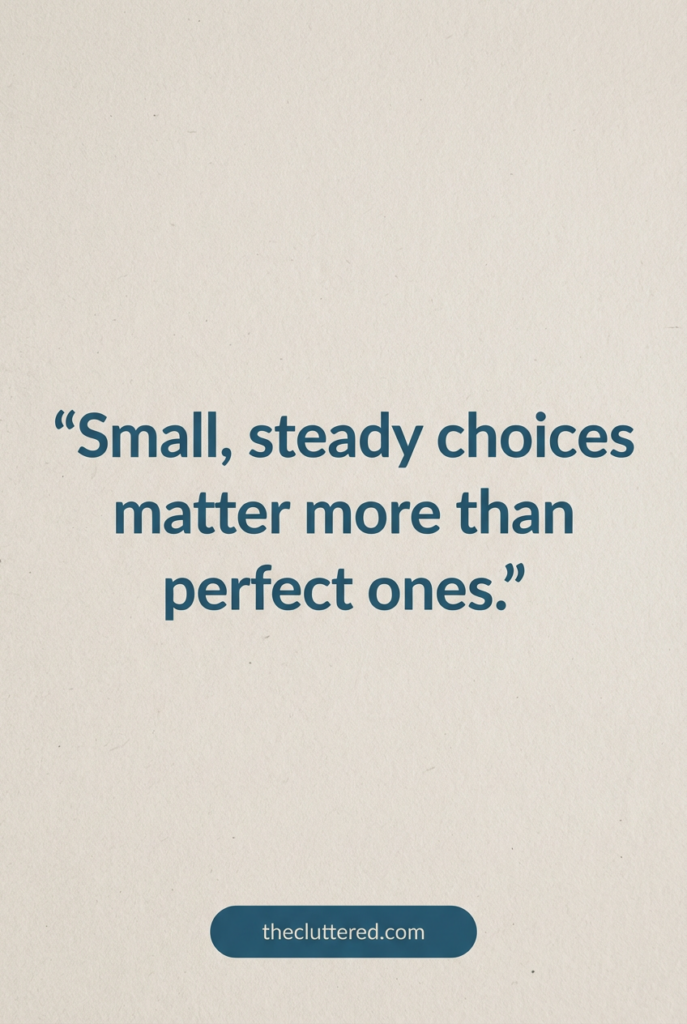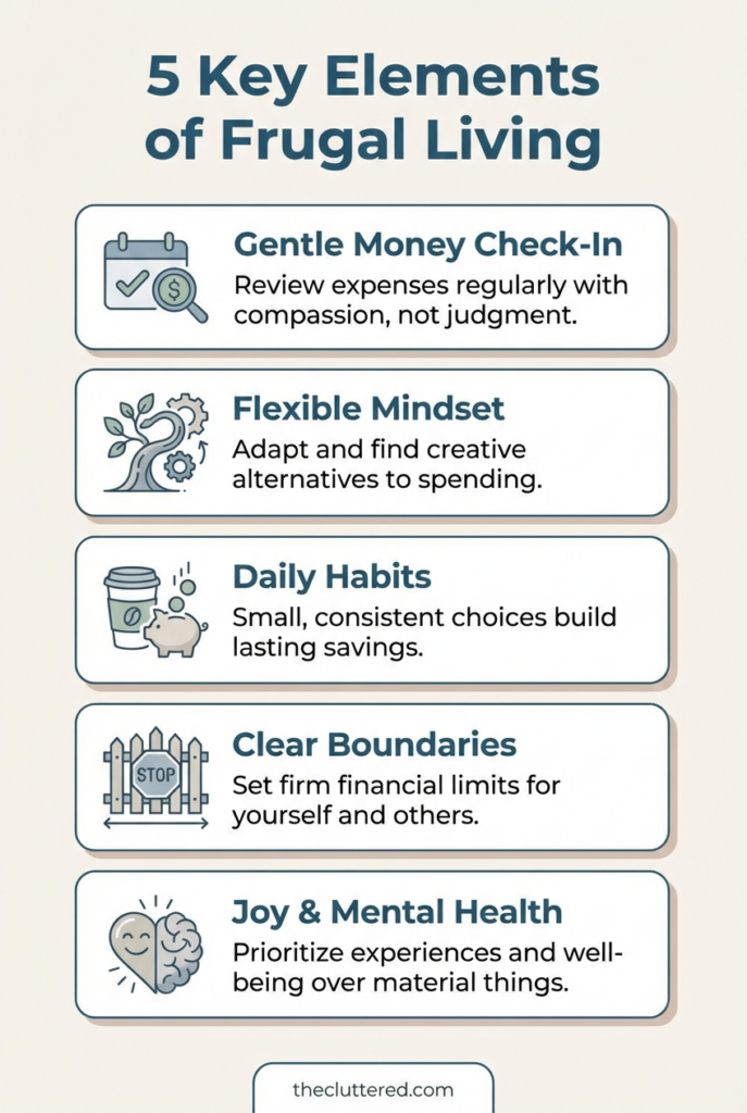 Mindset is what keeps this from turning into punishment. Instead of “I can’t have anything,” a frugal living mindset sounds like “I’m choosing what matters most right now.” This matters for frugal living mental health, especially if you’ve felt shame or anxiety around money. For instance, instead of banning coffee forever, you might decide on one cozy café visit a week and make the rest at home, turning it into a minimalist frugal living ritual you actually enjoy.