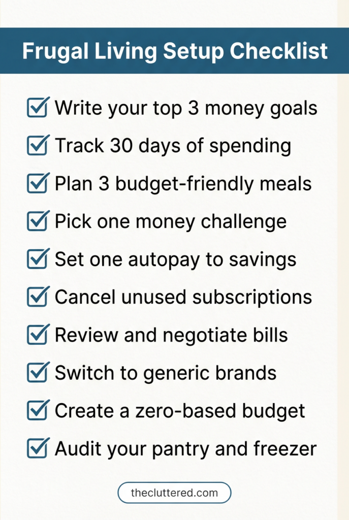 This step is about understanding why you want to start frugal living in the first place. Are you a frugal single mom on a tight budget, a young professional in an expensive city, or someone craving minimalist frugal living and less clutter? Write down 1–3 reasons like “pay off debt,” “lower stress,” or “save for a move or retirement.” When your why is clear, it’s easier to stick with frugal living habits instead of falling into old patterns and frugal living mistakes.