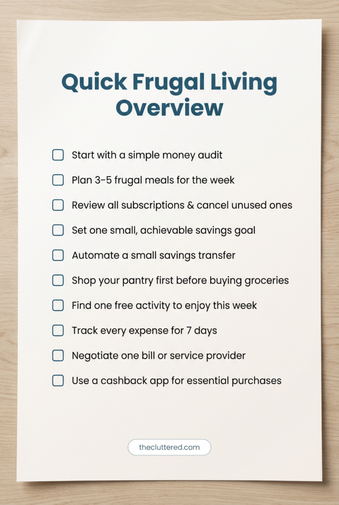 - A one-page frugal living checklist with daily and weekly habit ideas.