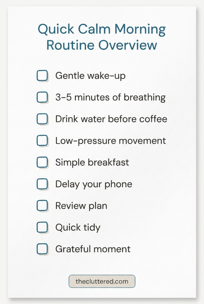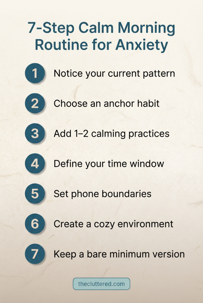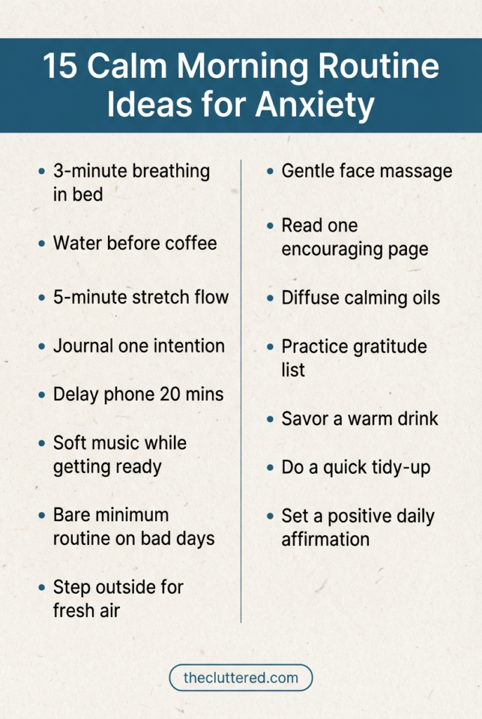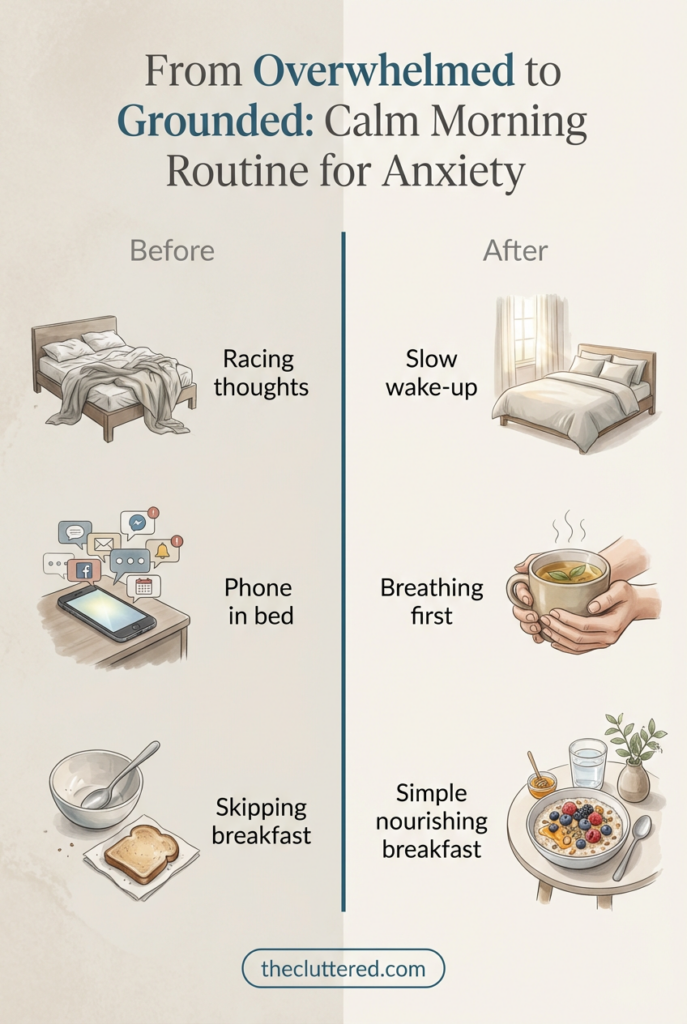 Waking up with anxiety can feel like your brain hits “panic” before you even open your eyes. Having a calm morning routine for anxiety isn’t about becoming a totally different person overnight—it’s about creating a softer landing for your mind and body. When you learn how to create a calm morning routine when you have anxiety, your mornings stop feeling like a battle and start feeling more like a gentle ramp into the day instead of a cliff. In this guide, you’ll get simple morning routine ideas, a cozy checklist, step‑by‑step actions, and anxiety friendly habits you can actually keep, even on low‑energy days. Save this guide to come back to later, and follow @theclutteredblog on Pinterest for more calm, cozy routine ideas.