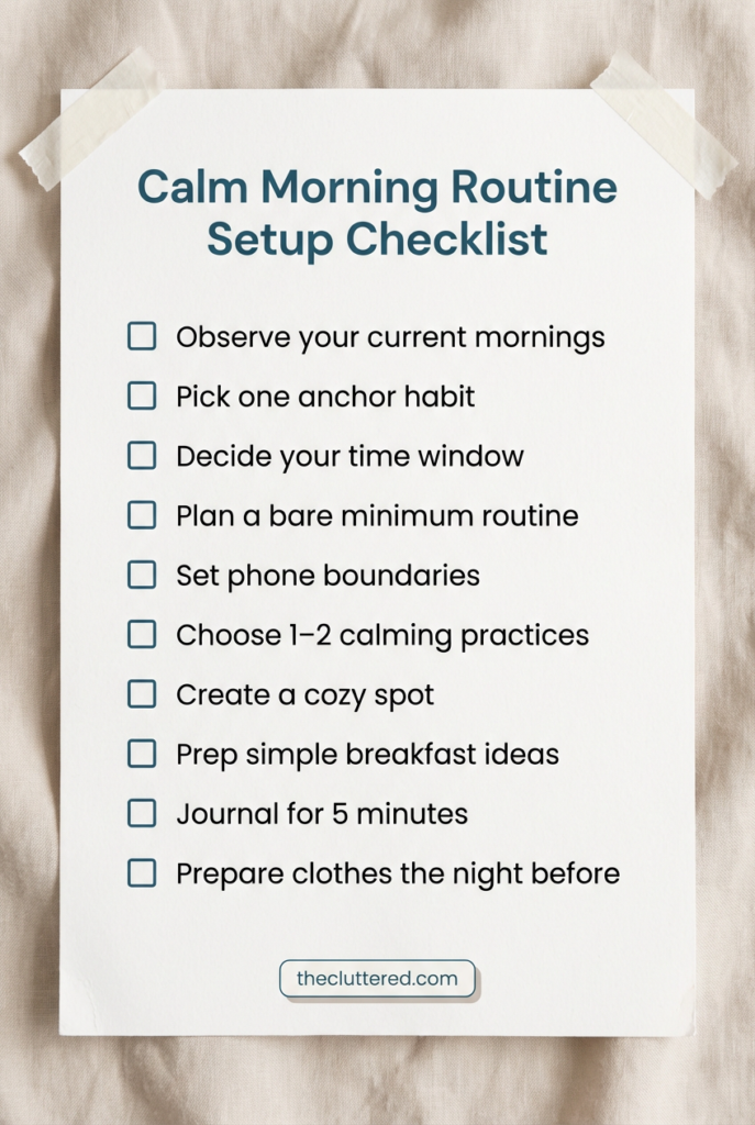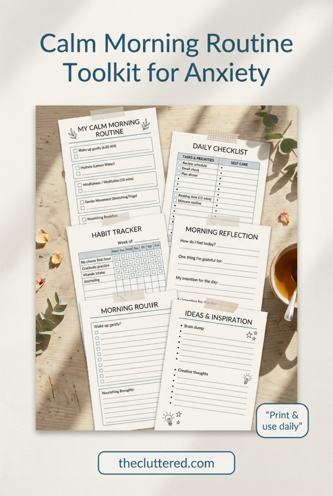 You don’t need a perfect, aesthetic routine to deserve a calm morning. Start tiny, be kind to yourself when you miss days, and let your routine evolve with you. Save this post so you can return to the checklists and ideas anytime, and follow @theclutteredblog on Pinterest for more cozy, anxiety friendly routines and slow living inspiration.