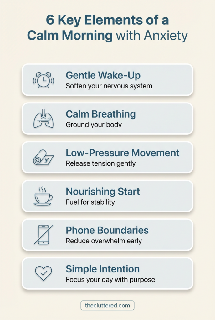 A good anxiety friendly morning routine is built from a few simple pillars. You can start with one or two and add more over time as they feel natural.