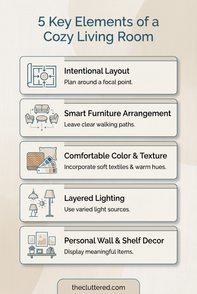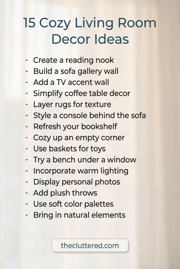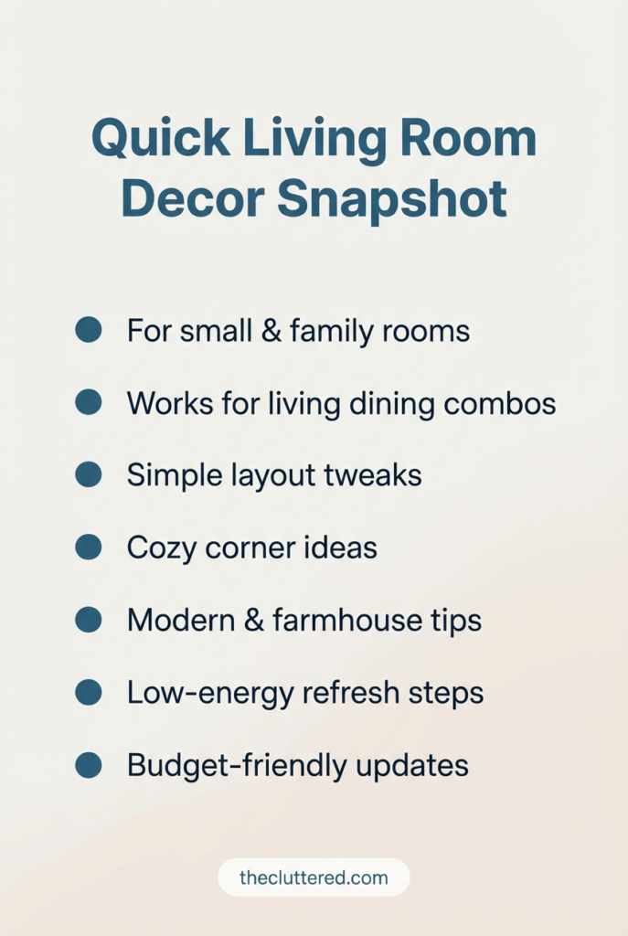 If your living room currently feels a bit blah, crowded, or like a random mix of furniture you never fully planned, you’re not alone. Cozy living room ideas don’t have to mean a full renovation or buying all‑new pieces. With a few intentional changes to your living room layout, color schemes, and decor, you can turn any space—especially a small living room—into a calm, stylish hangout you actually want to be in every night. This guide walks you through small living room decor, modern and farmhouse living room ideas, smart furniture arrangement, and simple styling tricks you can steal in a weekend. Save this post to revisit later and come hang out with us on Pinterest at @theclutteredblog for more cozy home inspiration.