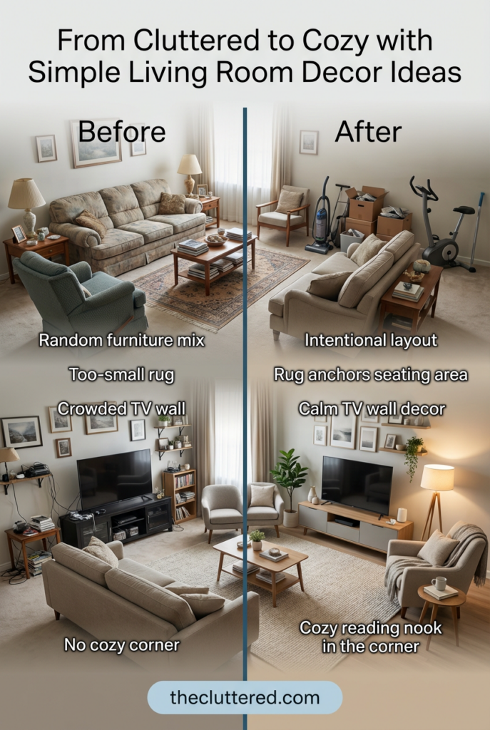 Imagine this: before, your living room is a mix of hand‑me‑down furniture, no clear living room layout, a rug that’s too small, and random wall decor that doesn’t quite match. The TV wall is crowded with cables and small decor pieces, the living room corner ideas you pinned are still just screenshots, and there’s no clear cozy living room reading nook or gathering spot. After a thoughtful living room refresh weekend, the sofa and chairs are grouped around a correctly sized rug, your living room fireplace or main art piece is the focal point, and living room shelf styling feels curated instead of chaotic. You’ve added a soft lamp and comfy chair in that awkward corner for a cozy corner living room zone, and your living room color schemes now feel calm and cohesive. The bones of the room haven’t changed, but the energy absolutely has.