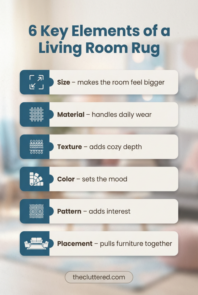 When you’re scrolling living room rug ideas, it helps to have a simple framework in mind. Every successful living room rug usually nails these key elements: size, material, texture, color, pattern, and placement. Size creates that “pulled together” look; material and texture decide how cozy and durable it feels; color and pattern influence how calm or bold the room reads. Placement is the quiet hero that makes modern living room rugs look intentional instead of like a floating island in the middle of the floor. Once you understand these pillars, you can mix living room rug trends with timeless choices so your space still feels current in a few years.