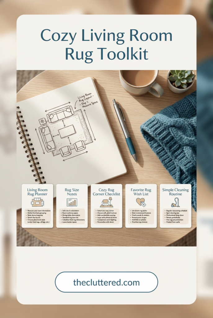 Before you commit to a rug, it helps to “plan it out” on paper or on your tablet so you can see how size and placement will feel. Sketch your living room shape, add your sofa, chairs, and coffee table, then draw different rug sizes underneath—5′ x 8′, 8′ x 10′, 9′ x 12’—to see which layout looks most balanced. Use this as your personal living room rug size guide, especially if your room layout is tricky or slightly awkward. You can even note down cozy living room rug ideas you love (like layered rugs or textured neutrals) next to each sketch so you have a mini rug planner to reference while shopping. This simple planner habit turns random scrolling into a calm, intentional decision.
