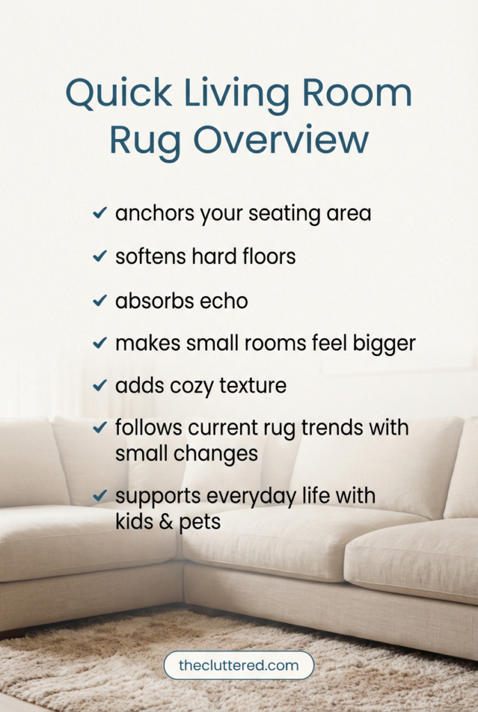 If your living room feels a little flat, echoey, or “not quite finished,” your rug is probably doing less work than it could. Living room rug ideas aren’t just about pretty patterns; the right rug can make your space feel bigger, calmer, and more intentional. We’ll walk through the best rugs for living room comfort, a simple living room rug size guide, and fresh living room rug trends that actually work in real homes. Think cozy living room rug ideas for small spaces, modern living room rugs for open plans, and easy layered rug ideas in the living room that you can try this weekend. Save this post to your decor board and come hang out with @theclutteredblog on Pinterest for more calm home inspiration.