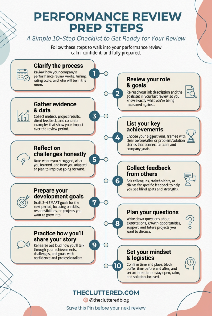In this guide, you will get a simple 10‑step performance review prep plan you can follow every time your review comes around. Use it as a printable checklist, a digital note, or a planner spread so you never have to “wing it” again.
