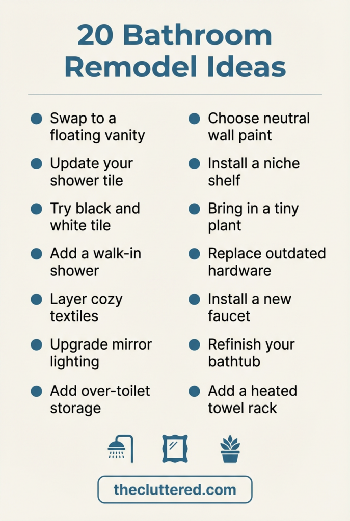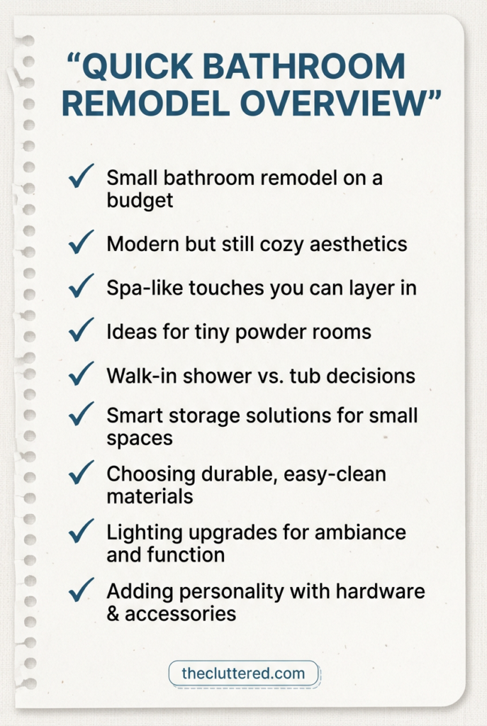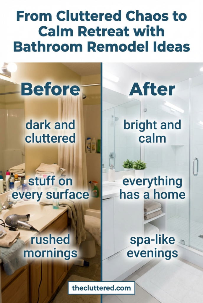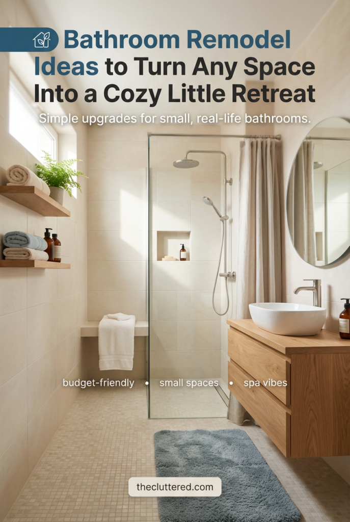 If your bathroom currently feels cramped, outdated, or just… blah, you’re not alone. Bathroom remodel ideas can feel overwhelming when you’re staring at beige tiles from 2003 and a vanity that’s seen better days. But with a few intentional choices, you can turn even a tiny, awkward bathroom into a cozy, spa‑like space that actually makes you exhale when you walk in. We’ll walk through realistic bathroom remodel ideas for small bathrooms, modern and minimalist looks, budget‑friendly upgrades, and even spa‑level touches you can add slowly over time. Think of this as your friendly Pinterest‑style guide to planning a bathroom you love—whether you’re doing a full gut renovation or just layering in small weekend projects. Save this post to your “bathroom remodel ideas” board and follow @theclutteredblog on Pinterest so you can come back to it as you plan.
