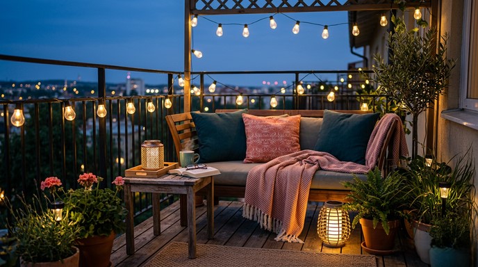 - Hang solar string lights along the railing or overhead for a soft canopy effect.