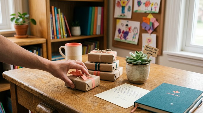 When money is tight, focus on budget friendly end of year teacher gifts that emphasize words, time, and creativity. A simple handwritten note or letter, a small drawing from your child, or a printed class photo with messages on the back can mean more than an expensive item. You can also organize a group gift so families contribute what they can, which adds up without pressure on any one person. Small, thoughtful items like homemade baked goods, a single flower, or a dollar-store notebook with a kind message are all perfectly valid ways to say thank you.